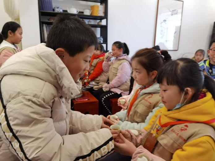 点香焚香除妄念,洗杯冰心去凡尘,凉汤玉壶养太和,投茶清宫迎佳人……小记者们围观学习茶艺,并双手奉上一杯遵义红茶,对父母的养育之恩表达感谢。